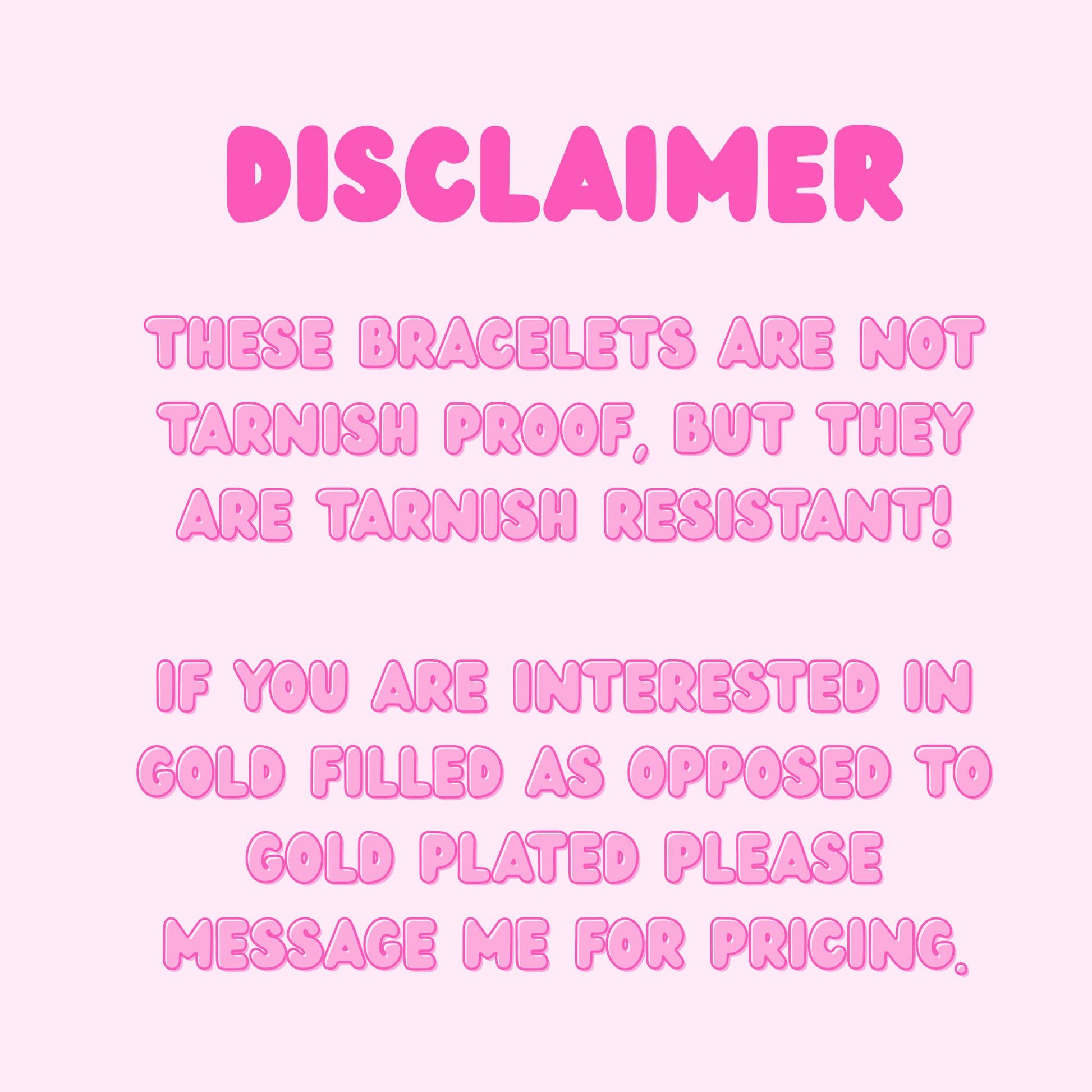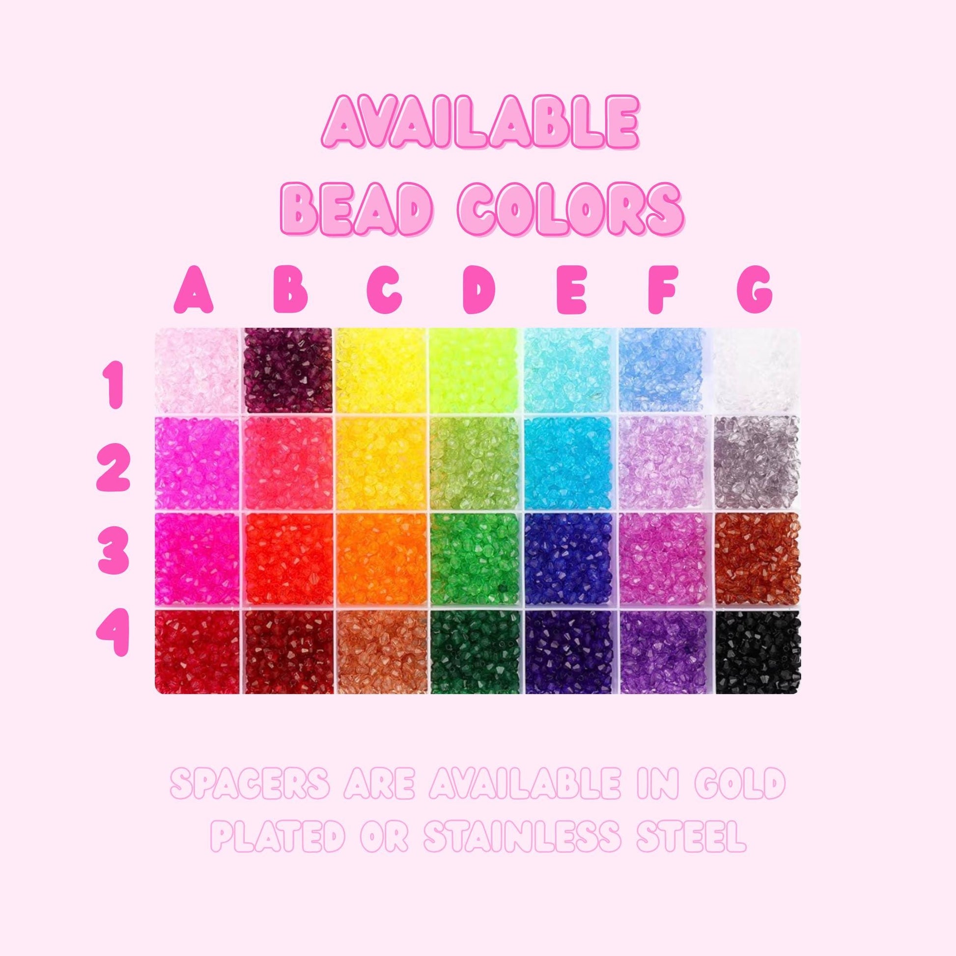 Each bracelet features shimmering 6mm bicone beads, accented by gold-plated or stainless-steel spacers (your choice of finish). The center is adorned with acrylic 4.5mm square letter beads to spell out your chosen word or phrase.